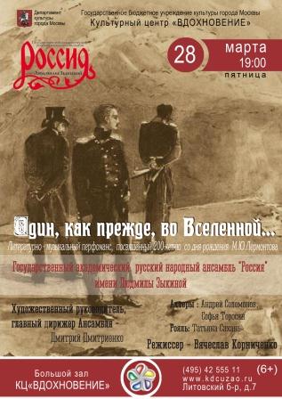 | «Один, как прежде во вселенной» Печальный демон - дух изгнанья... Таким запомнили его современники, сослуживцы, таким он и предстает нам в своей мятежной, рвущейся на волю из глубины сердца прекрасной поэзии. Не было в мире поэтов с такой напряженной и увлекательной, трагичной и скоротечной судьбой! Стоит перелистать страницы его книг, его стихотворений, его бесконечной души; услышать гармонию его слов, чтобы понять, что он навсегда остался в русской культуре, в самой основе ее. Он навсегда остался и в нашей жизни и в нашей речи и в нашем сердце... Один, как прежде, во вселенной... Михаил Лермонтов. 28 марта Культурный центр «Вдохновение» представляет музыкально-поэтический перфоманс «Светись далекая звезда», посвященный Михаилу Юрьевичу Лермонтову. В 2014 году вся Россия отмечает двухсотлетний юбилей со дня рождения великого поэта и писателя. Сложно ощутить и понять, как много успел сделать Лермонтов за столь короткую жизнь. Он покинул этот мир совсем молодым, немного не дожив до двадцати семи лет. Лермонтов был и остается одним из самых любимых и читаемых писателей в России. На сцене Культурного центра «Вдохновение» выступит ансамбль «Россия» имени Людмилы Зыкиной. Ансамбль был создан великой певицей более тридцати лет назад и сейчас носит ее имя. Каждое выступление ансамбля - это неповторимый музыкальный спектакль, где великие артисты с любовью рассказывают нам о человеческих чувствах. Основа популярности ансамбля это мастерство исполнителей, яркость музыкальных аранжировок, богатство и уникальность инструментальных тембров, не имеющих аналогов в симфонической музыке. Отрывки из стихотворений Лермонтова, фрагменты драмы «Маскарад», произведения Арама Хачатуряна и известные романсы – всё в честь великого поэта на сцене Культурного центра «Вдохновение»! Вечер будет интересен зрителям любого возраста, от школьников, которые только начинают знакомиться с книгами Лермонтова до самых искушенных поклонников его творчества. Вечер пройдет под знаком любви к родному языку и литературе, ведь именно эта любовь делает народ сплоченным. Мероприятие проходит в рамках Года культуры в Российской Федерации и в рамках празднования двухсотлетия со дня рождения Михаила Юрьевича Лермонтова. Программа перфоманса состоит из самых разных по жанру произведений, как литературных, так и музыкальных. Молодые актеры драматического театра и кино Андрей Соломонов и Софья Торосян (Театры "Сатирикон" и "Твой Театр") разыграют сцены из таких произведений, как "Мцыри", "Демон" и, конечно же, драмы М.Ю. Лермонтова "Маскарад". Прозвучат романсы на стихи Лермонтова в исполнении лауреата международных конкурсов Ирины Крутовой. Украшением этой концертной программы служат музыкальные произведения: "Липа вековая" и «Вальс» к драме Лермонтова "Маскарад" Арама Хачатуряна в исполнении Ансамбля "Россия" имени Людмилы Зыкиной. В концерте не звучит со сцены ни одного лишнего слова - только поэзия и музыка, вся информация дается титрами на экране, как в кинофильме. Это подчёркивает ощущение актуальности, современности стихотворений Лермонтова. Режиссер - постановщик Вячеслав Корниченко Продюсер Елена Климова Художественный руководитель и дирижер Дмитрий Дмитриенко 28 марта 19.00 Вход по пригласительным билетам или по предварительной записи у администратора. Тел: 