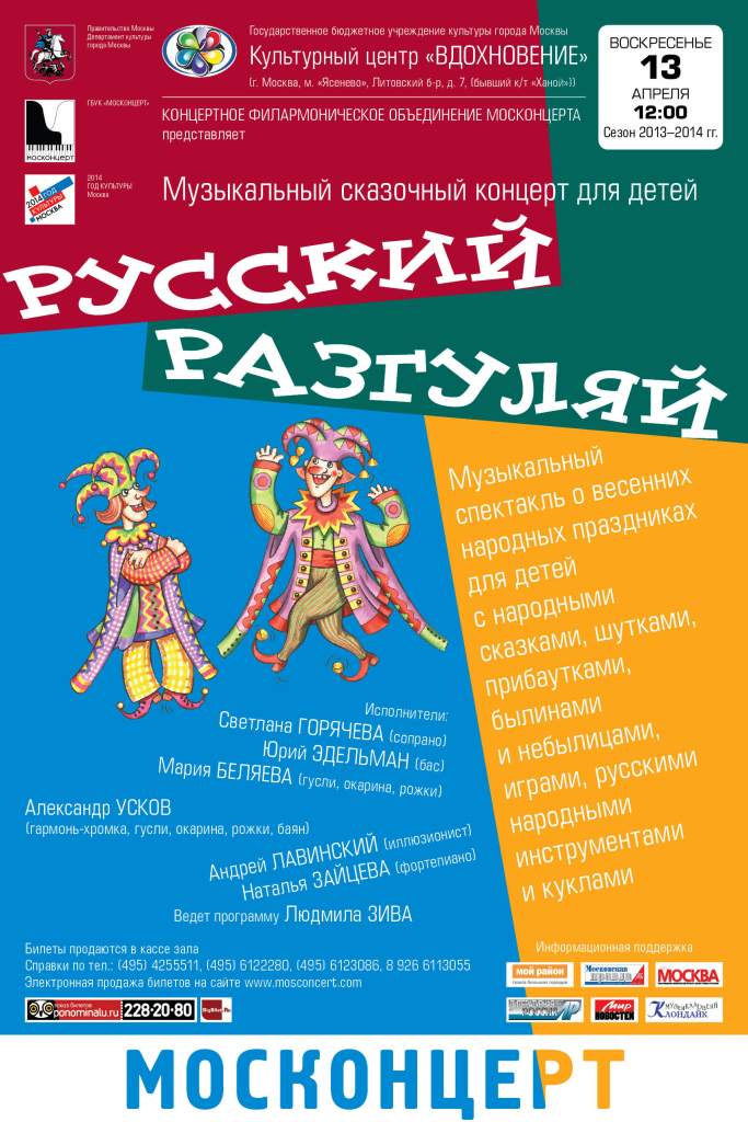 | Театрализованное представление «Русский разгуляй» 13 апреля Культурный центр «Вдохновение» и «Москонцерт» представляют удивительное театрализованное представление «Русский разгуляй». Это будет уникальный музыкальный спектакль о весенних народных праздниках для детей и взрослых с народными сказками, шутками, прибаутками, былинами и небылицами, играми, русскими народными инструментами и куклами! Вы сможете узнать и погрузиться в атмосферу празднования русских народных и православных праздников. «Благовещение», «Юрьев день», «Сретение», «Красная горка» и многие другие торжества. Вы узнаете о том, чему посвящены эти праздники, как их справляли на Руси и как мы отмечаем их сейчас! Приходите и приобщайтесь к русской культуре и народным традициям! Исполнители: Светлана Горячева (сопрано) Юрий Эдельман (бас) Мария Беляева (гусли, окарина, рожки) Александр Усков (гармонь хромка, гусли, окарина, рожки, баян) Андрей Лавинский (иллюзионист) Наталья Зайцева (фортепьяно) Ведет программу Людмила Зива 13 апреля 12.00 Билеты в кассе Культурного центра «Вдохновение» Телефон для справок: 8-495-425-55-11 http://kdcuzao.ru/