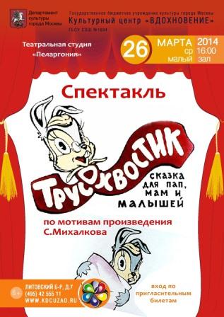 | Спектакль для всей семьи «Трусохвостик» 26 марта Культурный центр «Вдохновение» и театральная студия «Пеларгония» приглашает всех желающих посетить удивительный спектакль для всей семьи – «Трусохвостик»! Театральная студия «Пеларгония» была образована в 2007 году. 18 апреля 2008 года состоялась премьера спектакля «Ревизор или снова те же грабли», этот день решено считать днём рождения театральной студии. Художественным руководителем и основателем «Пеларгонии» является Бушуев Вячеслав Владимирович. В январе 2009 года "Пеларгония" стала лауреатом II степени на окружном конкурсе школьных театров в рамках фестиваля "Юные Таланты Московии" со спектаклем "Ревизор или снова те же грабли". Весной студия принимала участие в фестивале, посвященном 200-летию со дня рождения Николая Васильевича Гоголя с отрывком из произведения "Майская ночь, или утопленница". В декабре 2012 года состоялась первая премьера вне стен учебного заведения, а именно в Культурном Центре "Вдохновение". В апреле 2013 года студия приняла участие во Всероссийском грантовом конкурсе "Чайка", который проходил в Санкт-Петербурге. Спектакль «Трусохвостик» создан по мотивам одноимённого произведения Сергея Михалкова. Все любимые персонажи произведения снова оживут на сцене! Приходите и вы первыми увидите новый спектакль! 26 марта 16.00 Вход свободный Телефон для справок: 8 (495) 425–55-11 http://kdcuzao.ru/