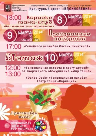 | Гид по праздничным весенним дням В дни весенних праздников Культурный центр «Вдохновение» подготовил несколько вокально-танцевальных мини-зарисовок, куда мы приглашаем всех желающих! Вход свободный! 8 марта 13.00 – «Караоке танц-клуб» «Весеннее настроение». Приходите и окунитесь в мир песни и танца! Песни, танцы, караоке - настоящее веселье для всех! 9 марта 17.00 – Праздничные посиделки «Семейного ансамбля Оксаны Никитиной». Уникальный фольклорный ансамбль, в котором участвуют и дети, и их родители! В основе репертуара - образцы русского музыкального фольклора: плясовые, хороводные, игровые песни, а также православный фольклор: колядки, духовные стихи. Лауреат Всероссийских и Международных конкурсов. Ансамбль активно участвует в городских и районных концертах, выступает на концертных площадках Москвы - в зале Церковных соборов Храма Христа Спасителя. У вас будет уникальная возможность услышать замечательный «Семейный ансамбль Оксаны Никитиной». Приходите и не пожалеете! 10 марта Art-этаж: на нескольких площадках будет представлена яркая, танцевальная программа! 12.00 «Танцевальная встреча в кругу друзей» от творческого объединения «Мир танца». В основе репертуара творческого коллектива «Мир танца» - историко-бытовой танец. Это неотъемлемая часть западно-европейского и отечественного культурного наследия в области хореографического искусства. Являясь самостоятельной дисциплиной, историко-бытовой танец в то же время тесно связан с другими видами танца, с общим историческим процессом развития хореографии. Вы сможете узнать, что такое историко-бытовой танец, из каких элементов он состоит, потанцевать и приобщиться к прекрасному!