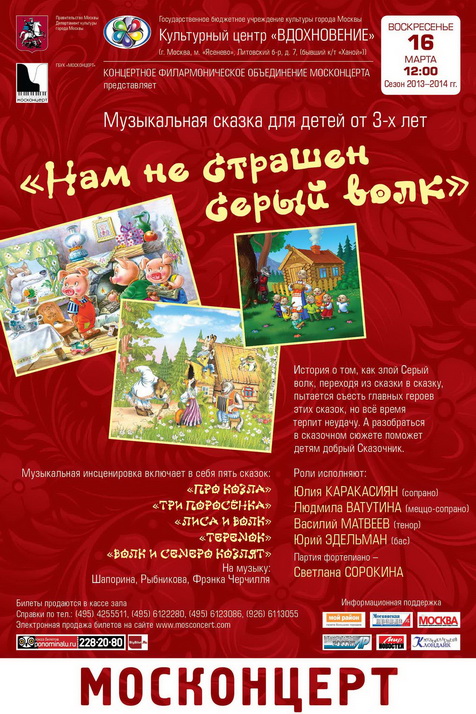 | Мюзикл для детей «Нам не страшен серый волк» «Нам не страшен серый волк, Серый волк, серый волк! Где ты ходишь, глупый волк, Старый волк, страшный волк?» Сергей Михалков 16 марта Культурный центр «Вдохновение» и «Москонцерт» представляют музыкальную сказку для детей «Нам не страшен серый волк»! Музыкальная инсценировка включает в себя пять известных и всеми любимых сказок: «Про козла», «Три поросенка», «Лиса и волк», «Теремок», «Волк и семеро козлят». История о том, как злой Серый волк, переходя из сказки в сказку, пытается съесть главных героев этих сказок, но все время терпит неудачу. Разобраться в сказочном сюжете поможет детям добрый Сказочник. Сумеют ли герои сказок перевоспитать волка, станет ли он хорошим? Все это вы узнаете – увидев музыкальную сказку! Вас ждут приключения, знакомства с новыми друзьями, интерактив! Вечное противостояние добрых и злых сил - все это любят взрослые и дети во всем мире. Борьба добра и зла, колдовство, магия - все это на сцене Культурного центра «Вдохновение». Приходите и не пожалеете! На музыку: Юрия Шапорина, Алексея Рыбникова, Фрэнка Черчилля. Роли исполняют: Юлия Каракасиян (сопрано), Людмила Ватутина (меццо сопрано), Василий Матвеев (тенор), Юрий Эдельман (бас). Партия фортепиано – Светлана Сорокина