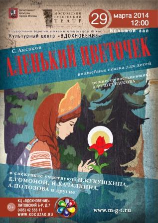 | Спектакль «Аленький цветочек» 29 марта Культурный центр «Вдохновение» и Московский Губернский Театр представляют спектакль «Аленький цветочек». Художественный руководитель Театра – Народный артист России Сергей Безруков. Сюжет знаменитой сказки Сергея Аксакова известен нам с самого детства: отправляясь в далекое плавание, купец Иван Кузьмич обещает дочерям привезти подарки. Старшей - золотой венец, средней - хрустальное зеркальце, а младшей Настеньке - аленький цветочек, увиденный ею во сне. В заморских странах купец встречает чудных иноземцев и сказочных животных, сталкивается со множеством испытаний и трудных ситуаций. Но самым таинственным из всего увиденного оказываются не сад и дворец, не скатерть-самобранка, не волшебные полати, а невероятной красоты аленький цветочек, и заколдованный Принц. Сказочное действие разворачивается на фоне оригинальных декораций. Тонко подобранный музыкальный ряд позволил режиссёру Алле Решетниковой раскрыть глубокий философский смысл, заложенный в хорошо знакомой нам с детства русской сказке «Аленький цветочек». Изящная режиссёрская фантазия, гармония красоты и смысла, чудеса и такая понятная человеческая история. Рассказ о настоящей любви, о красоте внутренней и красоте внешней весьма актуален и поучителен в современном мире. Эту сказку любят, ею восторгаются, на ней воспитываются. Вечное противостояние добра и зла, победа прекрасных чувств – все это любят взрослые и дети во всем мире. Приходите и получите настоящее удовольствие!