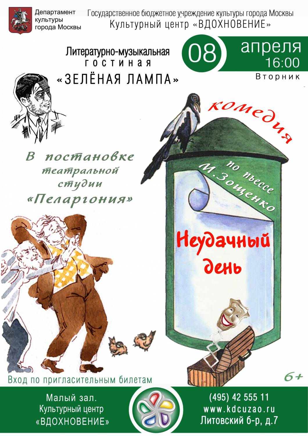 | Спектакль для всей семьи «Неудачный день» 8 апреля Культурный центр «Вдохновение» и театральная студия «Пеларгония» приглашает всех желающих посетить удивительный, премьерный спектакль для всей семьи – «Неудачный день»! Театральная студия «Пеларгония» была образована в 2007 году. 18 апреля 2008 года состоялась премьера спектакля «Ревизор или снова те же грабли», этот день решено считать днём рождения театральной студии. Художественным руководителем и основателем «Пеларгонии» является Бушуев Вячеслав Владимирович. В январе 2009 года "Пеларгония" стала лауреатом II степени на окружном конкурсе школьных театров в рамках фестиваля "Юные Таланты Московии". Весной студия принимала участие в фестивале, посвященном 200-летию со дня рождения Николая Васильевича Гоголя с отрывком из произведения "Майская ночь, или утопленница". В декабре 2012 года состоялась первая премьера вне стен учебного заведения, а именно в Культурном Центре "Вдохновение". В апреле 2013 года студия приняла участие во Всероссийском грантовом конкурсе "Чайка", который проходил в Санкт-Петербурге. Спектакль «Неудачный день» создан по мотивам одноимённого произведения Михаила Зощенко. Все любимые персонажи произведения снова оживут на сцене! Приходите и вы первыми увидите новый спектакль! Мероприятие проводится в рамках литературно-музыкальной гостиной «Зеленая лампа» и посвящено Дню юмора и смеха. 8 апреля 16.00 Вход свободный Телефон для справок: 8 (495) 425–55-11 http://kdcuzao.ru/
