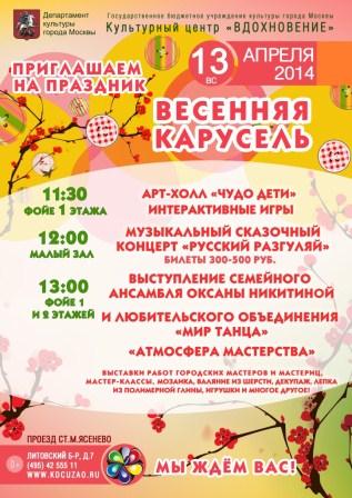 | «Весенняя карусель» в Культурном центре «Вдохновение» 13 апреля Культурный центр «Вдохновение» представляет «Весеннюю карусель»! Встречая весну, мы подготовили для вас целый день сюрпризов, танцев, мастер-классов, песен, плясок! Откроет праздник арт-холл «Чудо-дети», где родителей и их детей ждет увлекательная творческая мастерская. Все смогут поучаствовать в подвижных, интерактивных играх, повеселиться, научится делать поделки. Мы будем создавать удивительные чудо-деревья, раскрашивать яйца к Пасхе! Каждый ребенок уйдет с праздника с невероятным, им же созданным, чудо-деревом! «Москонцерт» покажет удивительное театрализованное представление «Русский разгуляй». Это будет уникальный музыкальный спектакль о весенних народных праздниках для детей и взрослых с народными сказками, шутками, прибаутками, былинами и небылицами, играми, русскими народными инструментами и куклами! Вы сможете узнать и погрузиться в атмосферу празднования русских народных и православных праздников, таких как «Благовещение», «Юрьев день», «Сретение», «Красная горка». Вы узнаете о том, чему посвящены эти праздники, как их справляли на Руси и как мы отмечаем их сейчас! После удивительного концерта всех желающих мы приглашаем на фольклорный концерт «Семейного ансамбля Оксаны Никитиной». В основе репертуара ансамбля - русский музыкальный фольклор, плясовые, хороводные, игровые песни, колядки, духовные стихи. Также перед гостями выступит творческое объединение «Мир танца». В основе репертуара творческого коллектива «Мир танца» - историко-бытовой танец. Это неотъемлемая часть отечественного культурного наследия в области хореографического искусства. Вы сможете узнать, что такое историко-бытовой танец, из каких элементов он состоит, приобщиться к прекрасному! Также всех желающих мы приглашаем на Московскую городскую выставку рукоделия «Атмосфера мастерства». Всевозможные мастер-классы к вашему вниманию: мозаика, валяние из шерсти, декупаж, лепка из полимерной глины, игрушки и многое другое! Для людей, которые интересуются вопросами здоровья, подготовлены отдельные мастер-классы: концепция неуязвимого организма, умная еда/Smart Food, скандинавская ходьба! Концепция неуязвимого организма: на занятии будут затронуты вопросы физиологии здорового организма, что может житель современного мегаполиса использовать для поддержания своего здоровья. Практическое занятие с проведением тестов (анкетирование на обезвоживание и закисление), измерением рН слюны (как наглядный показатель закисления организма). Скандинавская ходьба – это новый вид оздоровления организма, вы узнаете об истории её возникновения, о технике ходьбы, сколько калорий сжигается при ходьбе и многое другое! Умная еда - Smart Food (как противовес Fast Food). «Мы есть то, что мы едим» - владеем ли мы необходимыми знаниями, чтобы получать сбалансированный и полноценный рацион? Практическое занятие - правильно читаем этикетки продуктов. Полезные, вредные и опасные продукты питания. А что же нужно нашим клеткам? Приходите и вы узнаете много нового! 13 апреля 11.30 Телефон для справок: 8-495-425-55-11 http://kdcuzao.ru/