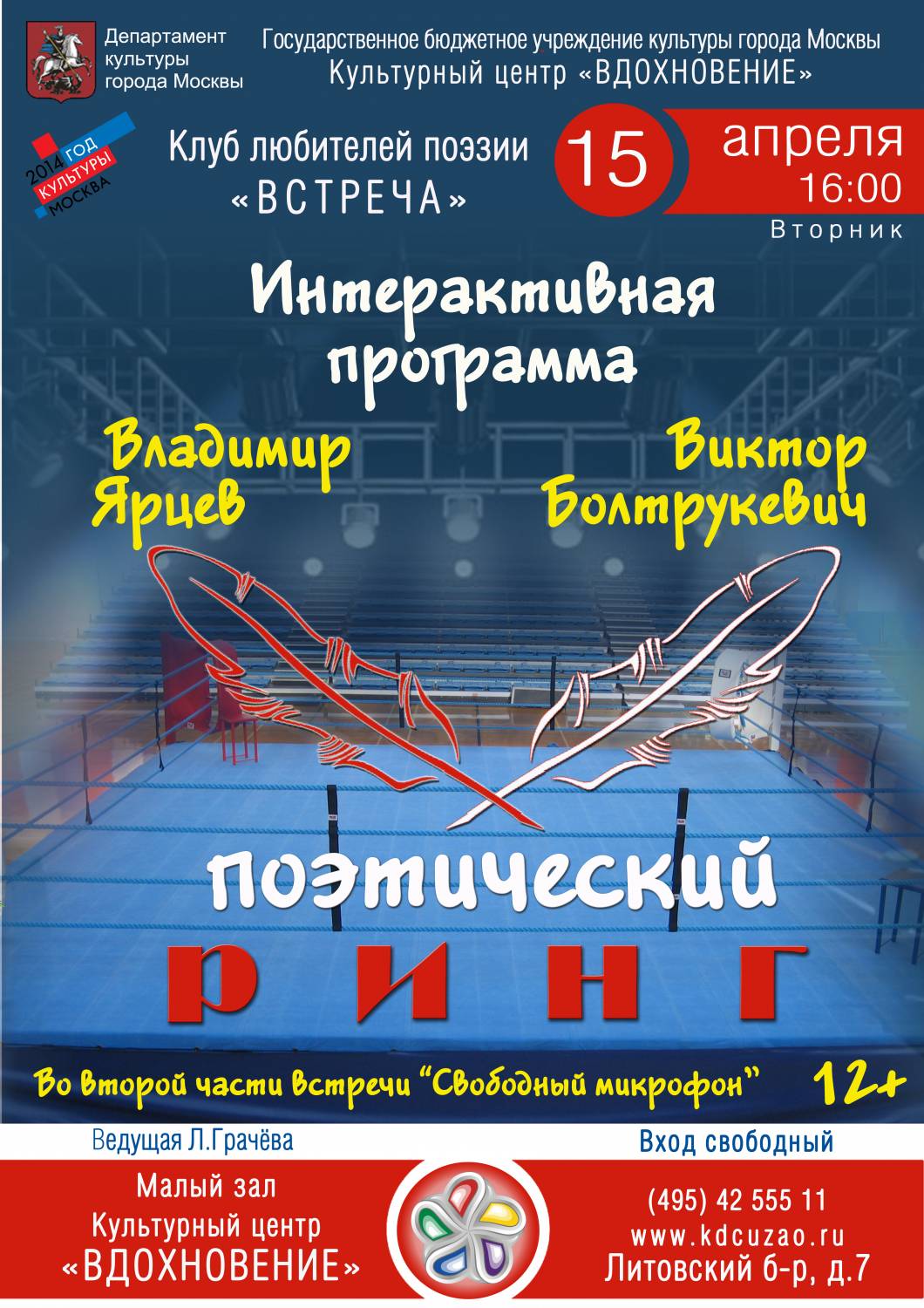 | Интерактивная программа «Поэтический ринг» 15 апреля в 16.00 Культурный центр «Вдохновение» приглашает всех желающих в клуб любителей поэзии «Встреча» на интерактивную программу «Поэтический ринг». На ринге встретятся два поэта Виктор Болтрукевич и Владимир Ярцев. Виктор Болтрукевич – коренной москвич. С самого раннего детства увлекался литературой, сочинял стихи. В 1959 году поступил в Московский институт инженеров транспорта и окончил его в 1965 году. В студенческие годы писал песни и стихи для КВНа. В период с 1958 по 1962 год занимался в поэтическом объединении «Магистраль» при Центральном клубе железнодорожников у Григория Левина. В 2000 году в театре «Глас» с успехом прошел его творческий вечер. Виктор Болтрукевич является автором двух книг. В 1991 году в издательстве «Прометей» вышел сборник «Стихотворения», в 2000 году – сборник «Эх, Россия, Русь моя». Владимир Ярцев родился 8 марта 1932 года. Окончил Санкт-Петербургский государственный университет культуры и искусств. Работал директором областной библиотеки и в Управлении по делам библиотек Министерства культуры СССР. Стихи пишет с детства. Его произведения вошли в 18 различных сборников, изданных в разные годы. Публикуется в журналах «Библиотека», «Домосед», в районной газете Южного Бутова. В 2008 году вышел в свет его авторский сборник «В интерьере прошлого». Часто выступает со своими стихами в центре социального обслуживания Южного Бутова, а также на других площадках. На его стихи написано несколько песен. Приходите, будет интересно! Во второй части программы для всех желающих почитать свои стихи будет работать «Свободный микрофон». 15 апреля 16.00 Вход свободный http://kdcuzao.ru/