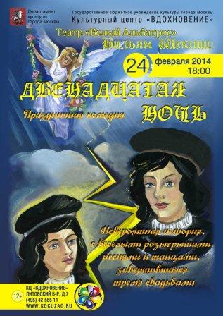 | Спектакль «Двенадцатая ночь» «О музыка, ты пища для любви! Играйте же, любовь мою насытьте, И пусть желанье, утолясь, умрет!» Уильям Шекспир «Двенадцатая ночь» 24 февраля Культурный центр «Вдохновение» и театр «Белый альбатрос» представляют феерический спектакль «Двенадцатая ночь» по пьесе главного драматурга в мире - Уильяма Шекспира. Мы приглашаем всех желающих посетить это великолепное событие! Театр «Белый альбатрос» был создан в 2004 году, художественный руководитель - Лора Ди. В этом году театр празднует свой первый юбилей – десятилетие творческой деятельности! Несмотря на молодость театра, многие спектакли уже отметили свой 100 и даже 200 юбилей! В 2006 году театр стал лауреатом 1-го Московского фестиваля "Вдохновение" в номинации "Спектакль для детей" (спектакль "Золотой цыпленок"). В Культурном центре «Вдохновение» театр «Белый альбатрос» покажет бессмертную комедию Уильяма Шекспира «Двенадцатая ночь». Невероятная история с веселыми розыгрышами, песнями и танцами, завершившая тремя свадьбами. Приходите и получите настоящее наслаждение от бессмертной классики! Официальный сайт театра: http://www.bely-albatros.ru/