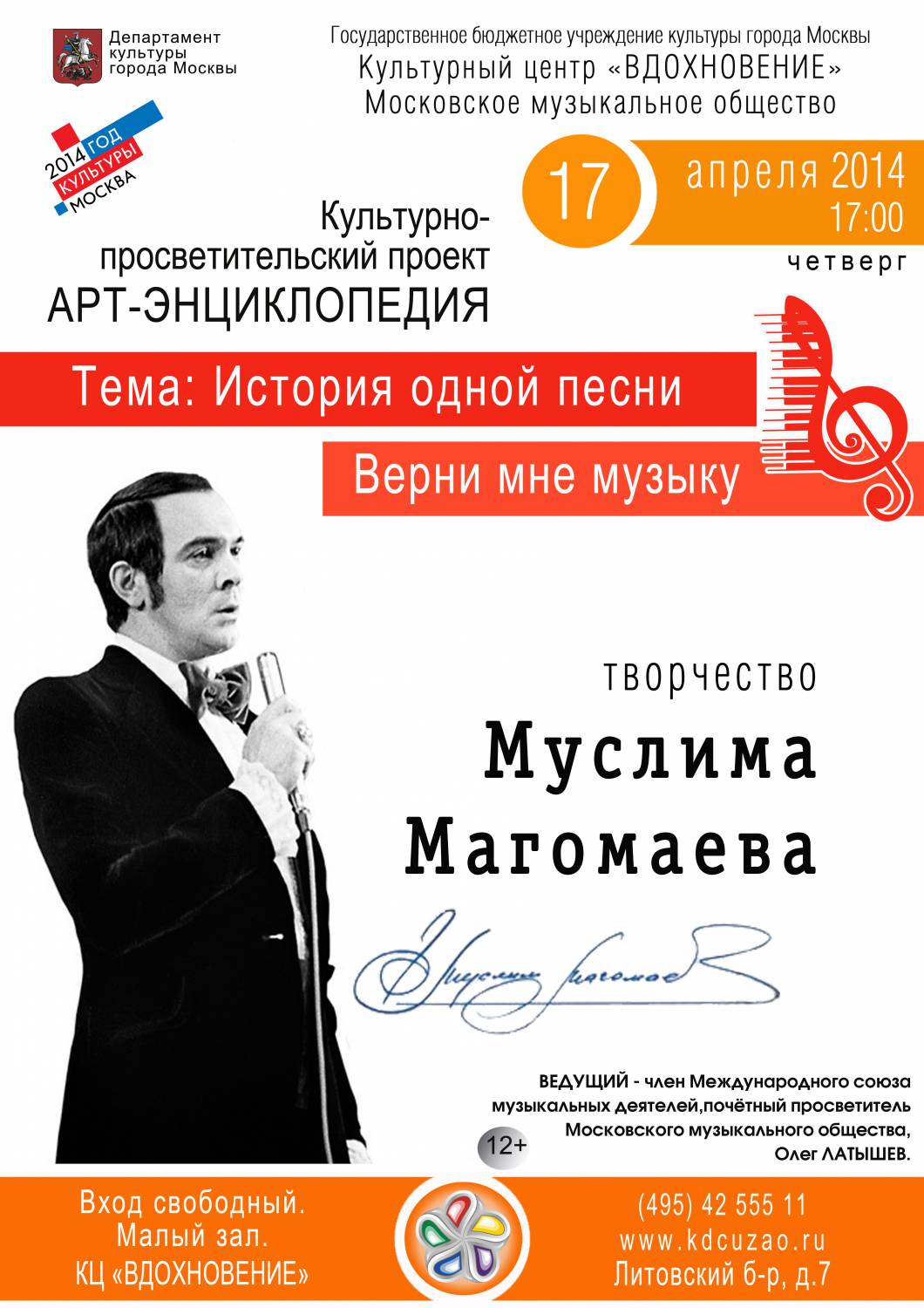 | «История одной песни. Верни мне музыку» Творчество Муслима Магомаева 17 апреля Культурный центр «Вдохновение» представляет Культурно-просветительский проект «Арт-энциклопедия» и приглашает всех посетить вечер «История одной песни. Верни мне музыку», посвященный творчеству Муслима Магомаева. Проект проходит в рамках Года культуры в Российской Федерации. Проект отвечает на злободневные и вечные вопросы одновременно. Что такое искусство? Чтобы раскрыть смысл этого понятия, нужно понять различные формы, которое искусство принимало от истоков до сегодняшнего дня. Искусство творится человеческой энергией. Люди, которых мы называем художниками, зодчими, композиторами, литераторами - создают живопись, архитектуру, музыку, поэзию. А мы называем всё это «произведениями искусства». Великие художники вдохновляются тем, что видят в окружающей действительности, но не копируют её, а воссоздают заново. Речь пойдёт о самых великих и необычных произведениях и исполнителях России и мира, об искусстве, которое меняет людей к лучшему. Тематический раздел «История одной песни» расскажет о творчестве выдающихся композиторов, поэтов и исполнителей, работавших в жанре песни. Встреча «История одной песни. Верни мне музыку» посвящена творчеству Муслима Магомаева. Неповторимый баритон, высокий артистизм и душевная щедрость Магомаева покорили не одно поколение слушателей. Диапазон его возможностей необычайно широк - оперы, мюзиклы, неаполитанские песни, вокальные произведения азербайджанских и русских композиторов. Муслим Магомаев родился в 1942 году. Стал известен в 19 лет, после выступления на молодежном фестивале в Хельсинки, а в 31 год был удостоен высшей награды – звания народного артиста СССР. На протяжении многих лет, певец продолжает оставаться кумиром миллионов, его имя стало своеобразным символом песенного искусства. Вечер проводится совместно с Международным союзом музыкальных деятелей. Ведущий лектория – член Международного союза музыкальных деятелей, почётный просветитель Московского музыкального общества, член Правления Клуба книголюбов «Центрального Дома Литераторов» Олег Латышев. 17 апреля 17.00 Вход свободный! Справки по телефону: (495) 425-55-11